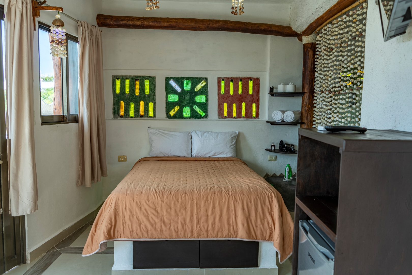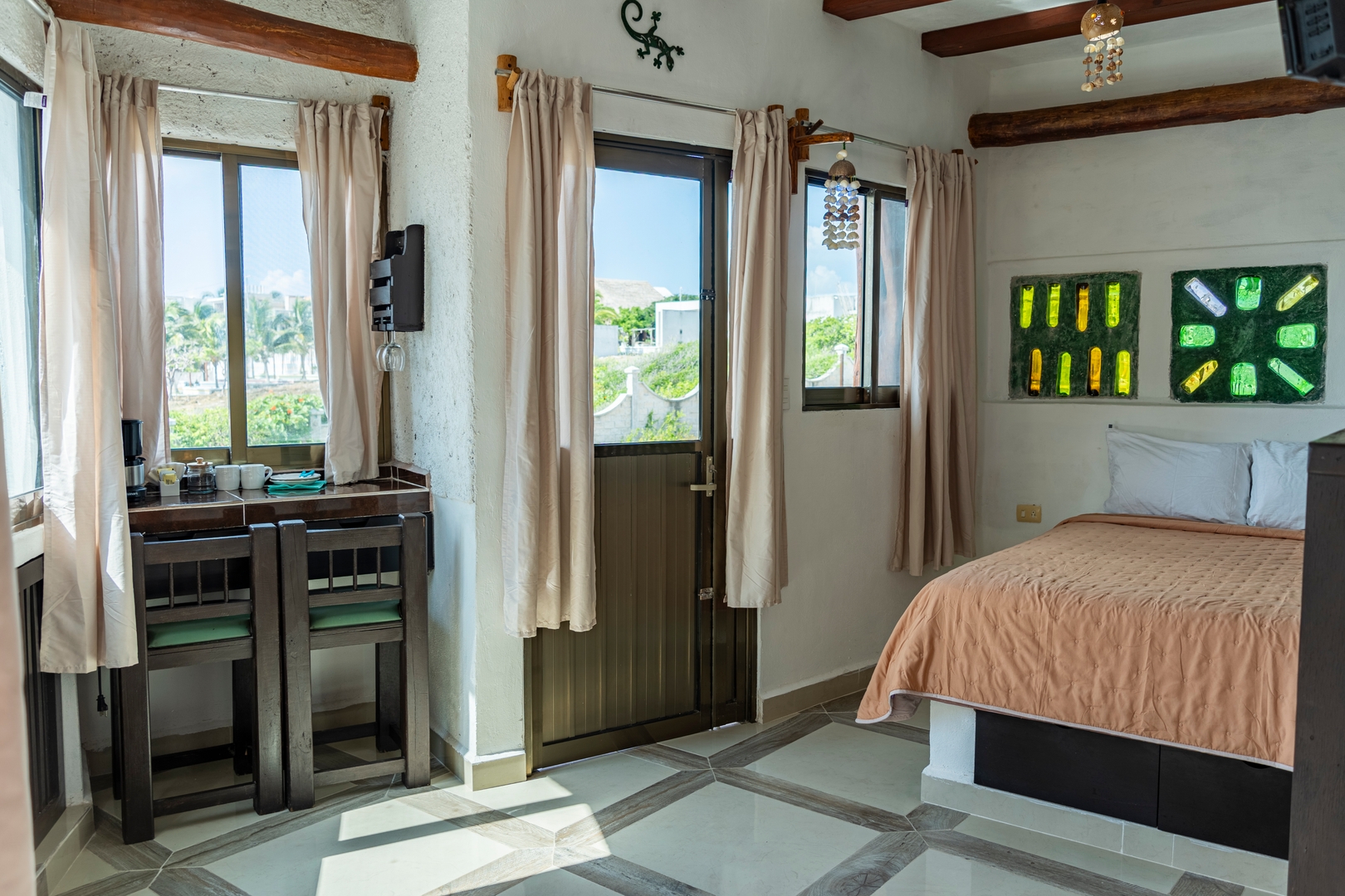 Unwind in this cozy double room in Isla Mujeres. Perfect for couples or solo travelers, it features a private bathroom, AC, ceiling fan, wifi, TV, minibar, coffee maker, hairdryer, iron, and a table with 2 chairs—great for meals, reading, or remote work. Everything you need for a pleasant Caribbean stay!