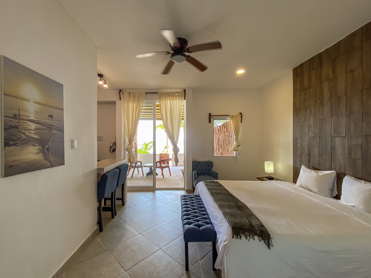 Azuk is your dream destination. Imagine waking up in a luxurious King or Queen bed, opening your sliding terrace door, and feeling the sand of the private beach under your feet. This modern rustic design studio for two people, on the first floor, gives you the ultimate connection to the sea. Your refuge features a fully functional kitchenette for preparing your morning smoothies and a private bathroom that guarantees your intimacy. Every detail is designed for an experience of absolute peace.
