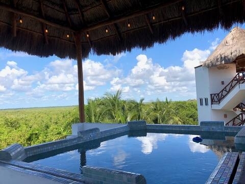 This Vanguard and Coastal Fusion accommodation in Puerto Morelos guarantees a calm and luxurious experience for adults. We prioritize tranquility, making it ideal for couples or solo travelers. Enjoy the pool, the rooftop jacuzzi with sea views, and the free use of bicycles to explore the area. We are only 200 meters from the beach. Access is via code, ensuring privacy.